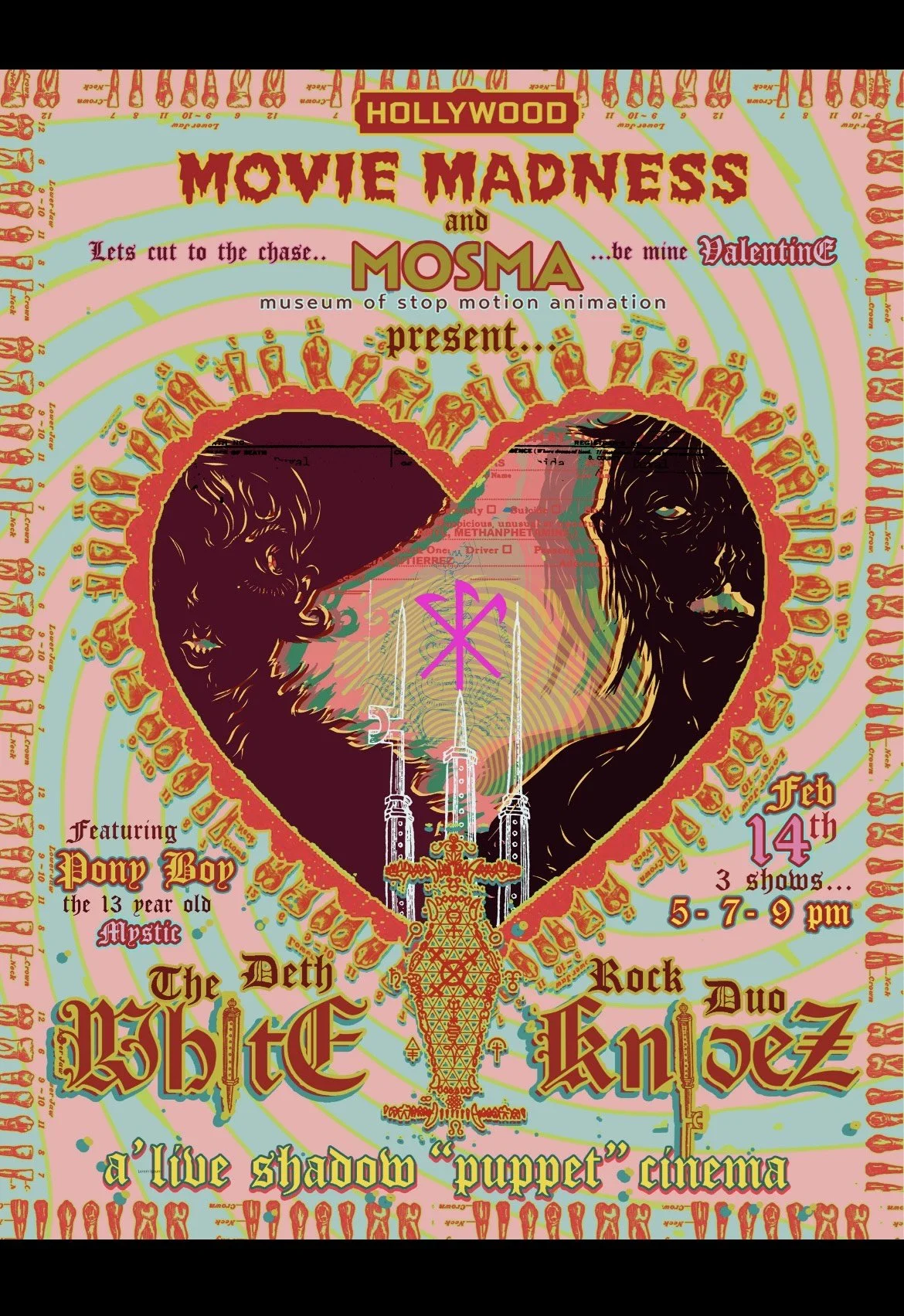 Come get lit as the death rock duo White Knivez slice through the screen of the Movie Madness Miniplex. Through the barriers of love, life and death. Materializing as intricate hand-cut paper silhouettes, conjuring their love story in a live shadow "puppet" cinema like you've never seen before! Cut with live music this deth rock operetta can Necro Nadia & Dead Mike save your soul?